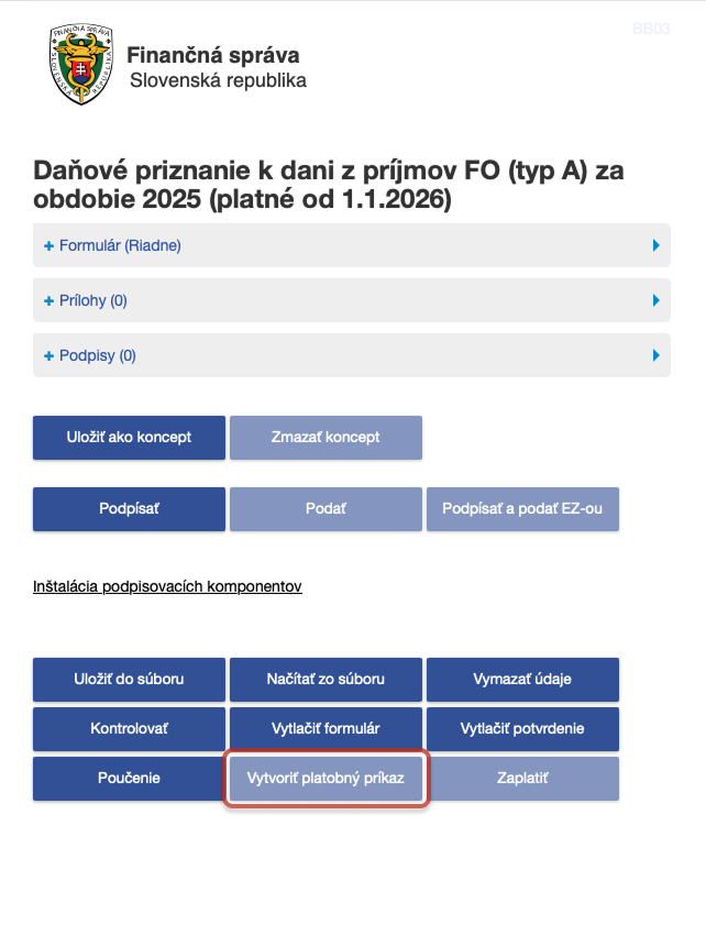 Payment immediately after submission If your tax return includes tax due for payment, the «Vytvoriť platobný príkaz»(Create payment order) button will become active after submission. Clicking it will generate a PDF with a QR code for payment via your mobile banking app.