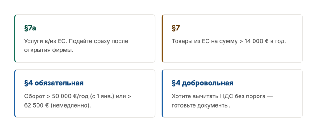 Важный момент: если вы уже зарегистрированы по §7a, отдельную регистрацию по §7 подавать не нужно. И наоборот. Одна регистрация покрывает оба случая.