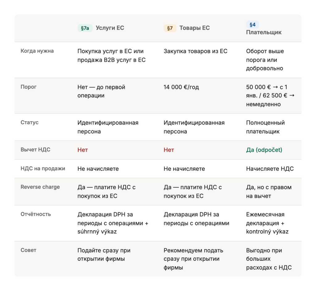 Идентифицированная персона (identifikovaná osoba, §7 и §7a) — вы получаете номер НДС, но не становитесь плательщиком. Вы платите НДС со своих покупок из-за рубежа, но не начисляете его на свои продажи. И главное — у вас нет права на вычет входящего НДС.